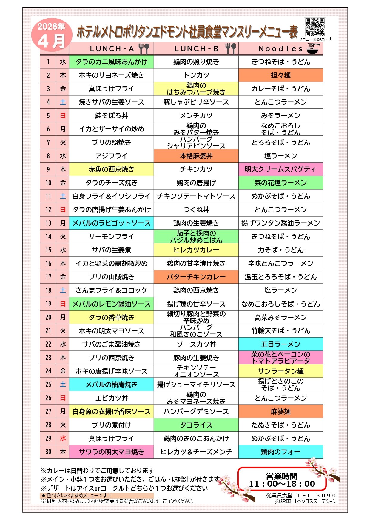 ホテルメトロポリタンエドモント社員食堂~今月の献立~