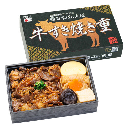 【駅弁】日本ばし大増 牛すき焼き重(にほんばしだいます ぎゅうすきやきじゅう)|【1,380円(税込)】|白飯に国産牛を使用した牛すき焼きを盛り付けました。付合せに、玉子焼・結び白滝煮・厚揚げ煮などを合わせました。